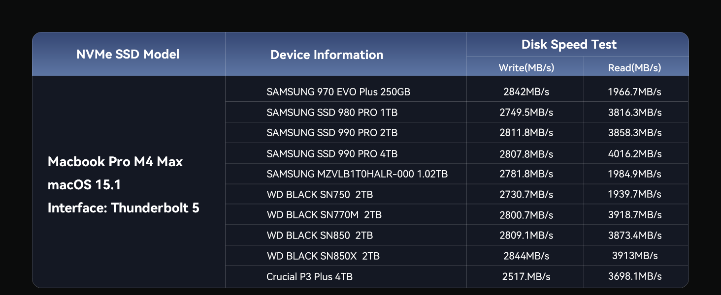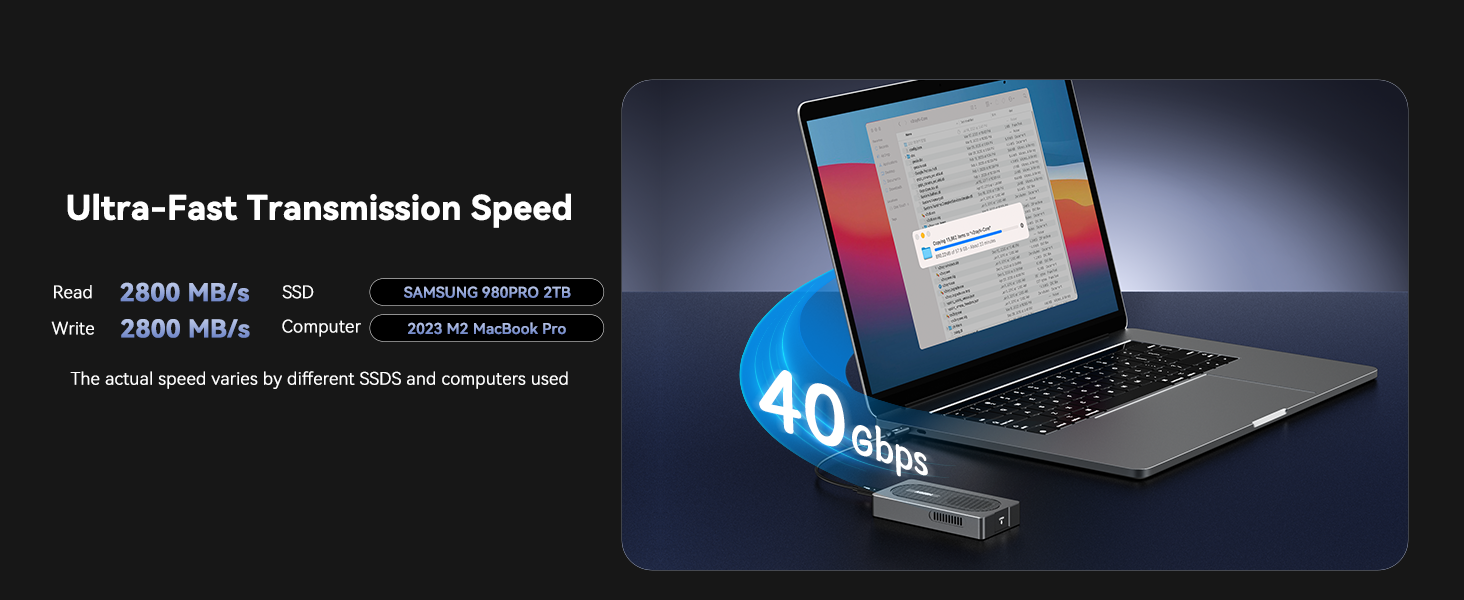 - 【40Gbps Transfer Speed】 Tested with Samsung 980 EVO Plus, Real-world speeds up to 2805MB/s (Read) and 2734MB/s (Write) enable rapid transfer of large files, ideal for video editing, gaming, and data-intensive workflows on Mac, Windows, or Linux systems.