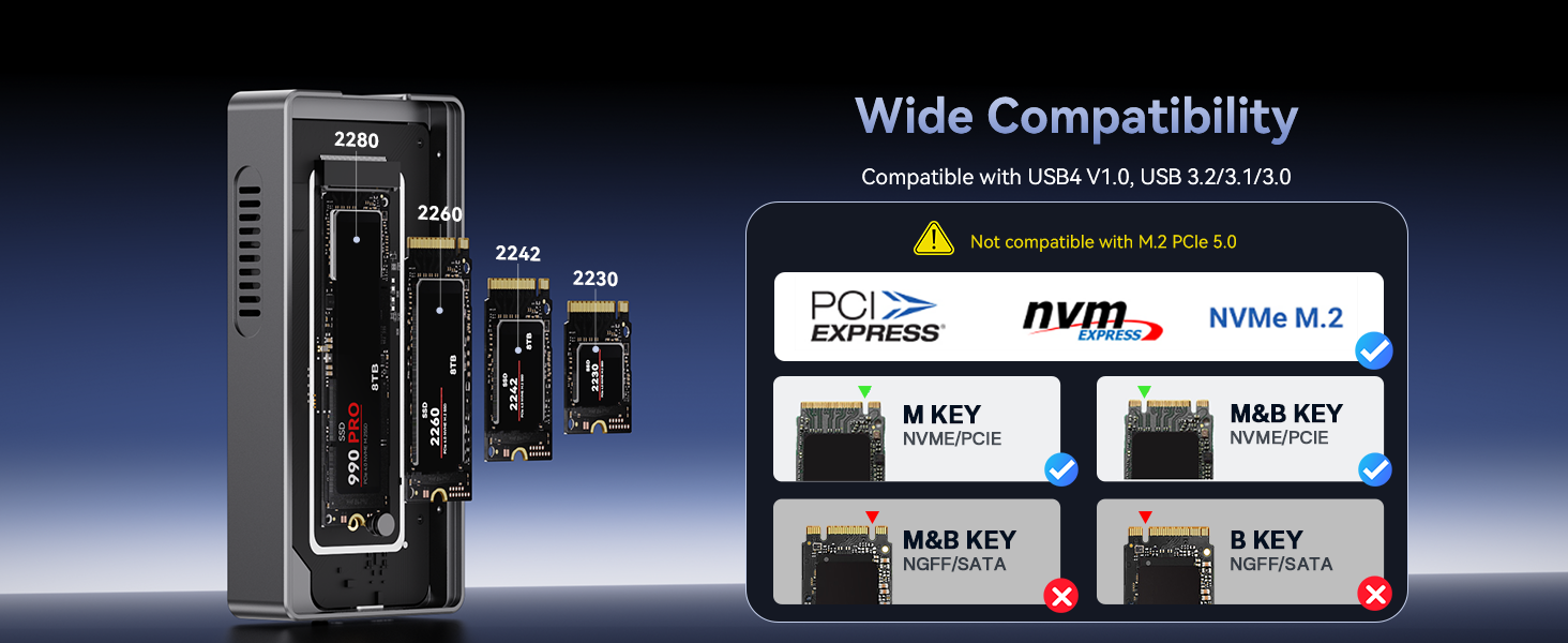 - 【Tool-Free Installation】Supports M.2 NVMe SSDs (2280/2260/2242/2230) with no screws required, enabling quick upgrades for travelers and mobile professionals. Note: SSD Not Included