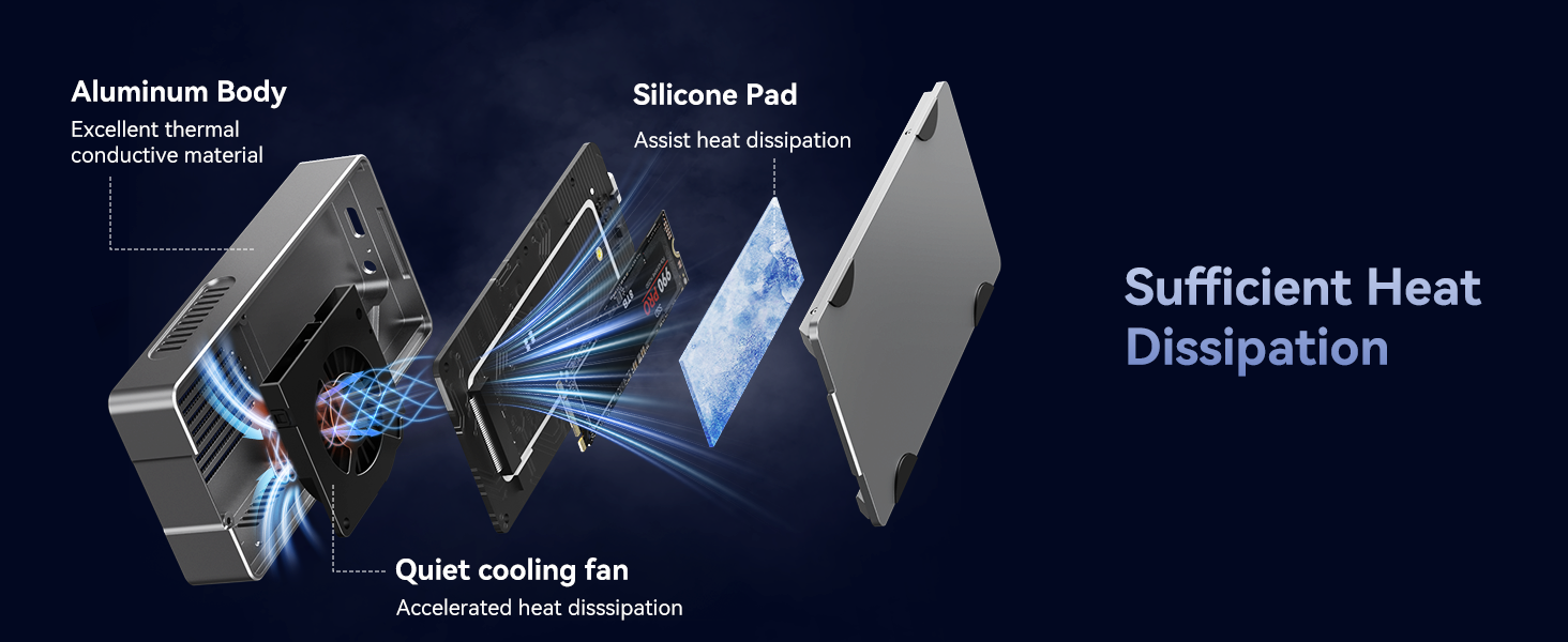 - 【Triple Heat Dissipation System】Engineered with a built-in cooling fan, aluminum alloy shell, and heat dissipation holes, this design maintains optimal SSD temperatures during intensive tasks, preventing thermal throttling for sustained high-speed performance.